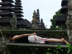 1. นอนคว่ำยืดแขนซ้ายเหนือศรีษะแล้วพับขาซ้ายไว้ที่ก้นนำมือขวาจับข้อเท้าซ้าย