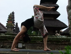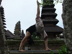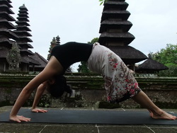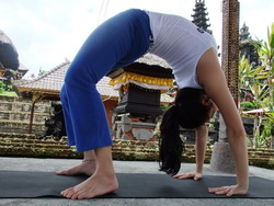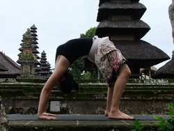 8. หายใจออกเดินเท้าทั้งสองข้างกลับมาที่ท่าสะพานโค้ง