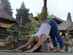3. หายใจเข้าแอ่นหลังดังภาพที่ 5 วางฝ่ามือขวาลงไปที่ฝ่าเท้าขวา ค้างท่าสักครู่ หายใจเข้าออก แล้วค่อยๆ ยกตัวขึ้น กลับมาเป็นท่าแมวครึ่งดอกบ้ว แล้วหายใจออกยกสะโพกขึ้นไปเป็นท่าสุนัขครึ่งดอกบัวดังภาพที่ 6 ค้างท่า หายใจเข้าออกสักครู่