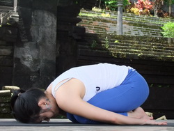 4. ยืดขาขวาไปเป็นท่าสุนัขสามขาดังภาพที่ 7 หายใจเข้าฉีกขาขวาไปด้านขวา 90 องศา ดังภาพที่ 8 หาความสมดุลของพลังแขน กระดูกเชิงกราน ต้นคอผ่อนคลาย รักษาระดับแขนและไหล่ หายใจเข้าออกค้างท่าสักครู่ แล้วค่อยๆ วางเท้าขวาลง เป็นท่าสุนัข แล้วพักในท่าเด็กหมอบ ดังภาพที่ 9 จากนั้นลองเริ่มทำใหม่ ทำสลับข้าง